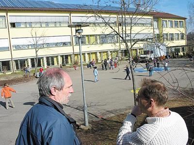 Klaus Fink (links) und Ralf Knop begutachten das Dach der Wannweiler Uhlandschule, auf dem die bestehende Solaranlage noch erweitert werden soll.