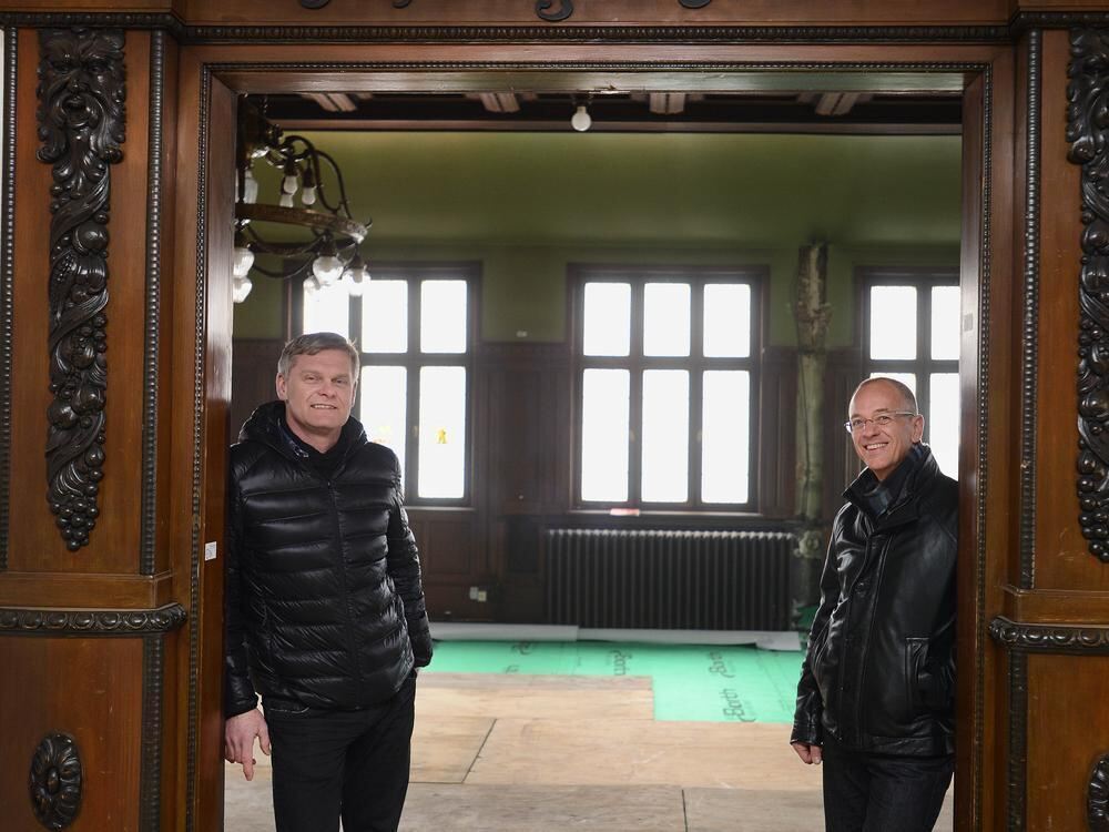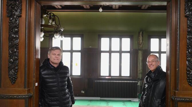 Wertvolle Holztäfelungen wie diese, an denen die Architekten Markus Haug (links) und Thomas Redlinger lehnen, gilt es im Alten Metzinger Rathaus während der Sanierungsarbeiten zu schützen. Auch der Boden und die Fenster bleiben erhalten.
