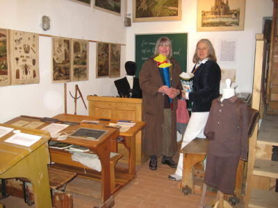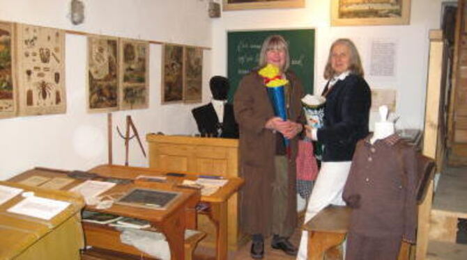 Plötzlich wird die Schule bunt: Doris Schuster, links, und Heiderose Tiefenbach in der neuen Ausstellung im Dorfmuseum.