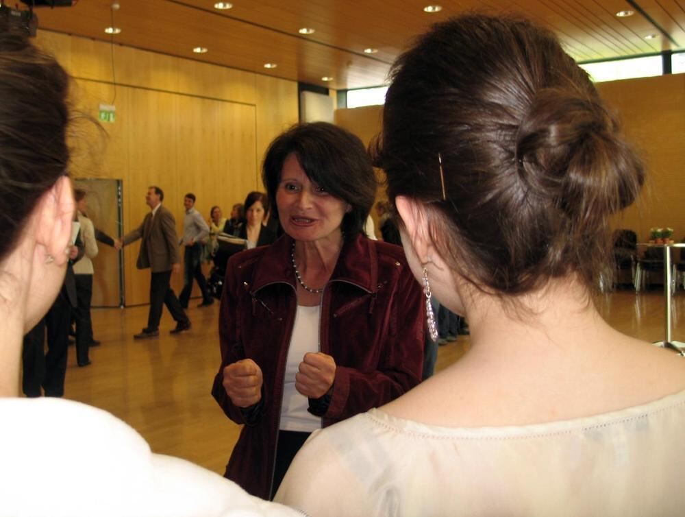 Baden-Württembergs Kultusministerin Marion Schick im Gespräch mit Schülerinnen des Dietrich-Bonhoeffer-Gymnasiums in Metzingen, die sie in der Aula musikalisch begrüßt hatten: »Toi ,toi, toi - und alles Gute für die Zukunft.«