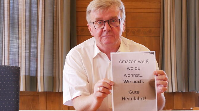 Bad Urachs Bürgermeister Elmar Rebmann mit einer Kopie des anonymen Droh-Flugblatts, das am Dienstagabend nach der Gemeinderatssitzung am Auto einer »am Verfahren beteiligten Person« hing. Das Original ist bei der Polizei.