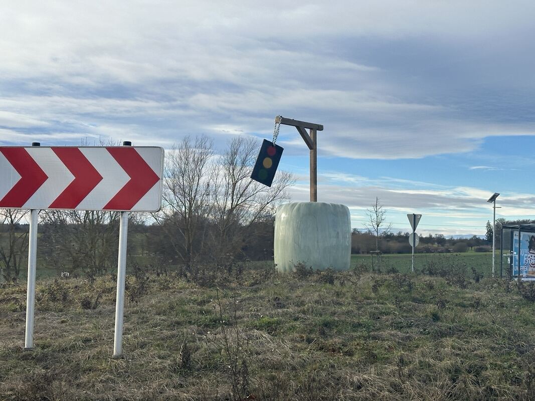 Der Ampel-Galgen am Kreisverkehr bei der Bullenbank nahe Walddorfhäslach und Pliezhausen.