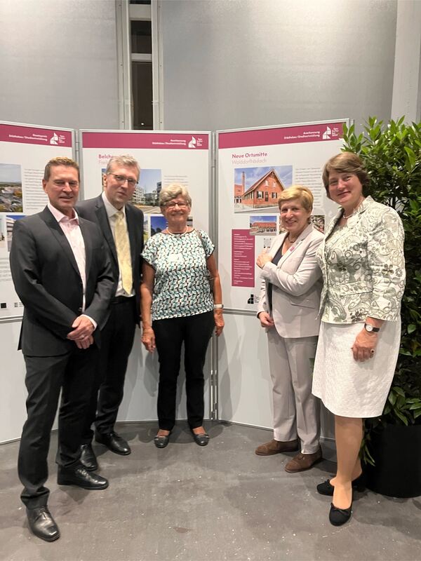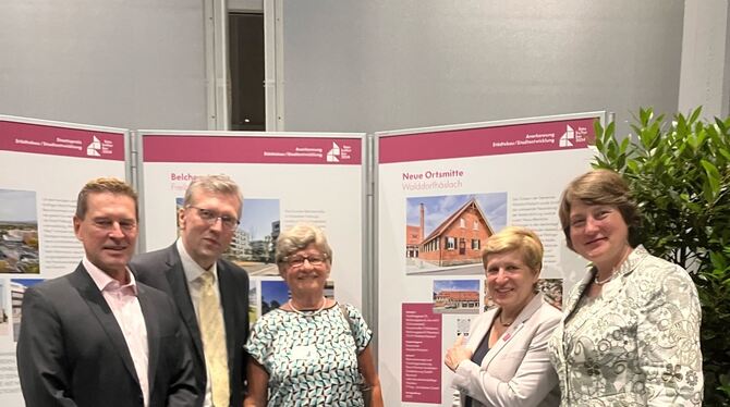 Ministerin Nicole Razavi (Zweite von rechts) und die Walddorfhäslacher Delegation Frank Baude, Olfert Alter, Inge Streicher und Bürgermeisterin Silke Höflinger (von links) zeigen die Walddorfer Ortsmitte auf einem Plakat.