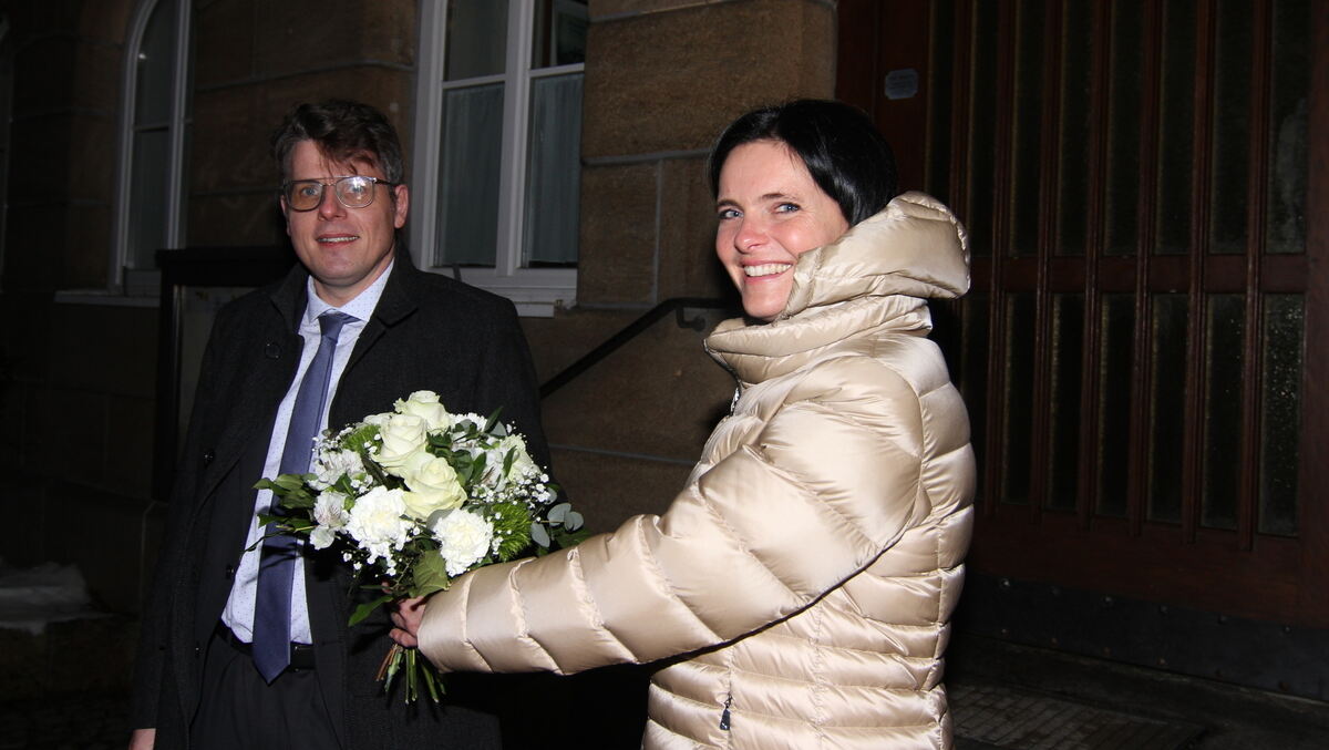 Anja Sauer und der noch amtierende Bürgermeister Matthias Winter am Wahlabend.