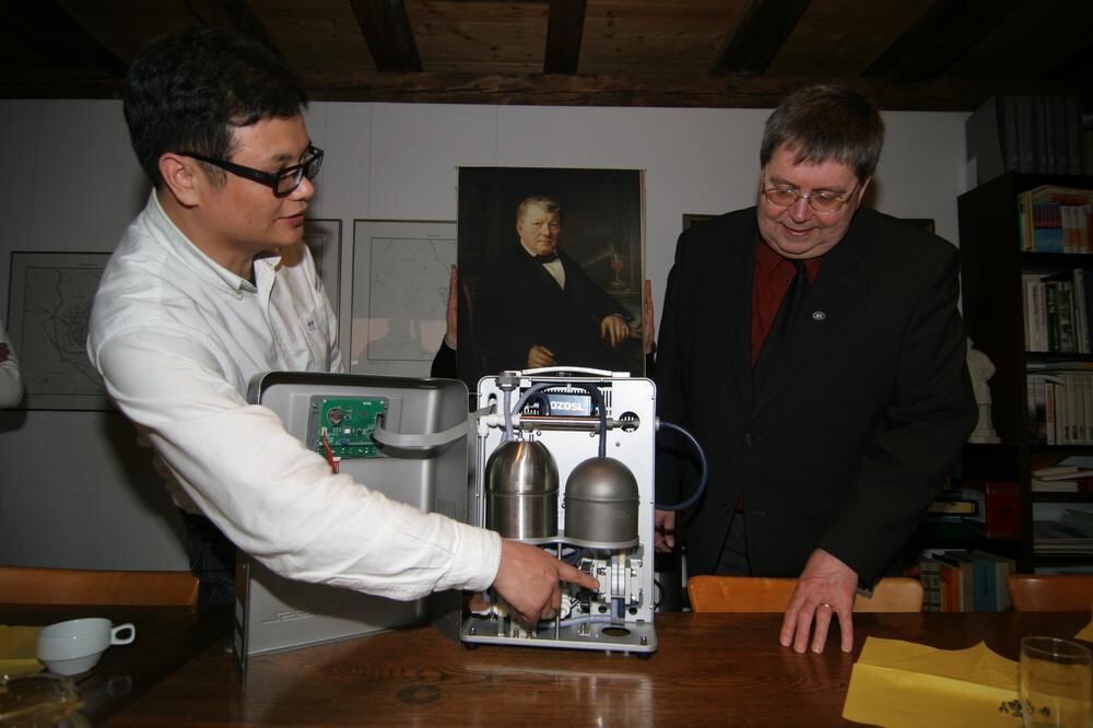 Zukunfts- und geschichtsträchtig zugleich: Dr. Yu Jian Ping (links) schenkt Metzingen (rechts Stadtrat Peter Rogosch als Vertreter von OB Dr. Ulrich Fiedler) einen Ozon-Generator.