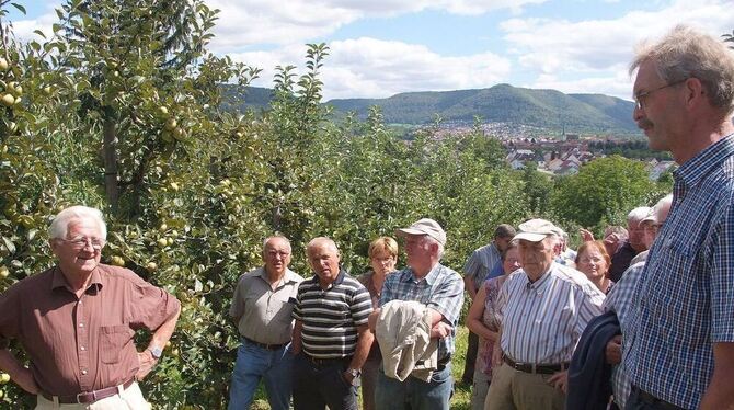 Paul Krohmer (rechts) vom Obst- und Gartenbauverein Dettingen beim Apfelrundgang.