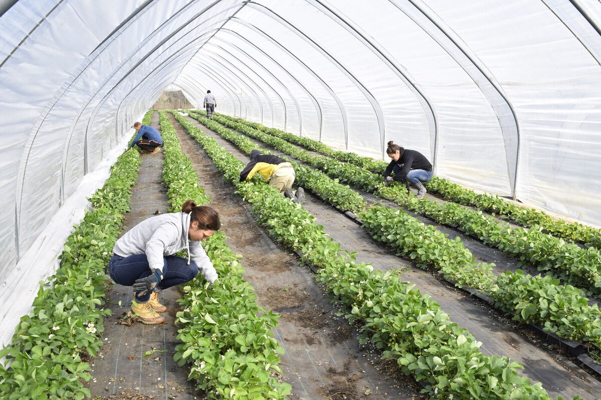Freiwillige Helfer jäten Unkraut auf einem Erdbeerfeld des Nürtinger Rammerthofs. Für die Spargelernte müssten sie erst noch zwei Wochen lang eingelernt werden. Denn das Spargelstechen ist nicht einfach. FOTO: WEBER