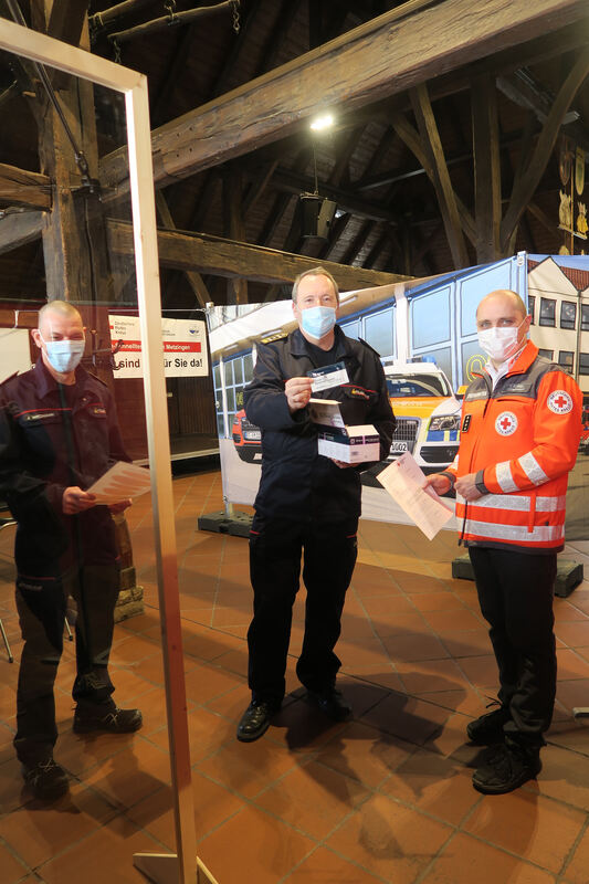 Solch eine Teststation gibt es nun in der Festkelter am Kelternplatz in Metzingen. Am Dienstag haben Oberbürgermeister Dr. Ulrich Fiedler, der Feuerwehrkommandant Hartmut Holder, sein Feuerwehrkollege Jochen Wiedmann und Daniel Schnell, der DRK-Bereitsschaftsleiter von Metzingen, diese vorgestellt.