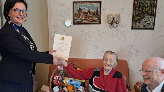 RÖMERSTEIN-BÖHRINGEN. Vor 100 Jahren kam Erna Kaldun in Ostpreußen auf die Welt und lebt jetzt seit mehr als 70 Jahren in Böhringen. Gestern, an Kalduns großem Ehrentag, überbrachte Römersteins Bürgermeisterin Anja Sauer ihr die Glückwünsche des Ministerpräsidenten und gratulierte der Altersjubilarin zusammen mit Ortsvorsteher Albrecht Müller im Namen der Gemeinde.
