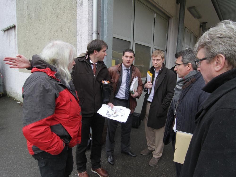 Bis hierher und nicht weiter: Dr. Johannes Ady (2. von links), Richter am Landgericht Tübingen, vermittelt zwischen der Stadt Bad Urach, vertreten von Bürgermeister Elmar Rebmann (rechts) und Rechtsanwalt Martin Vollmer (2. von rechts) und der Deutschen Post, vertreten von Rechtsanwalt Christof Kiesgen (Mitte).