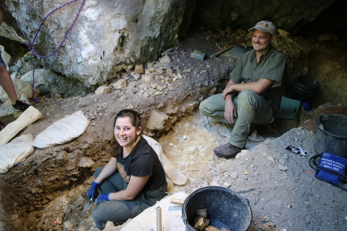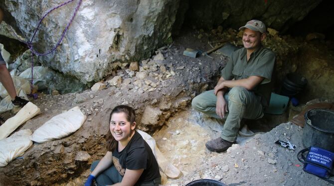 In einem vier Quadratmeter großen Bereich in der Höhle über Seeburg trägt Gregor Bader mit einer Mitarbeiterin Schicht für Schicht ab. Bader: »Alle Standortfaktoren, die für Jäger und Sammler wichtig waren, sind hier vorhanden.« FOTOS: OECHSNER
