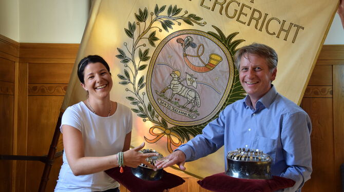 Peter Hiller, der zur Spielleitung der »Schäferlies« gehört, ist somit auch ein absoluter Kenner der Materie. In einem wird er sich von seinen Vorgängern unterscheiden: Er kommt nicht im schwarzen Anzug, sondern im Trachten-Look. Passend dazu wird Silke Maier ein fesches Dirndl tragen. Königs-Krone und Königinnen-Krönchen (Foto) hielten sie bei der Pressekonferenz im Rathaus schon mal symbolisch auf violettem Samt parat. Diese schmücken nach dem traditionellen Wettrennen die Häupter des neu gekürten Uracher Schäferkönigspaars.
