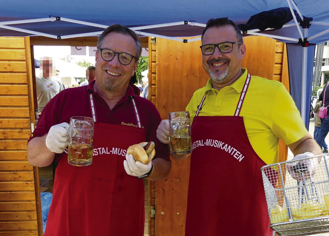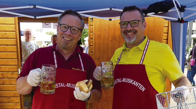 Ohne sie geht gar nichts: die beiden Pommes-Spezialisten Thomas Rapp und Sven Doster, die fürs Foto auch Bratwurst und Bier präsentieren. Dazu spielt zum Auftakt des Musiksommers Blasmusik aus Dettingen und Hülben.