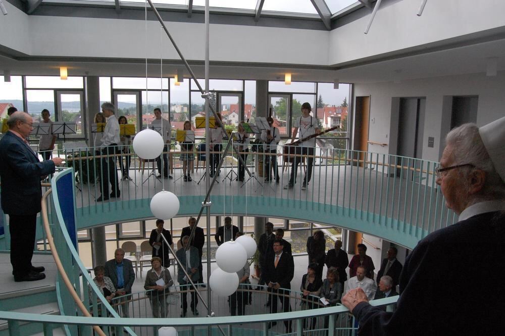 Reden, Instrumentalmusik, Gesang, Gebete und ein Stehempfang prägten die Eröffnung des »Haus am Weinberg« vor geladenen Gästen. In der lichtdurchfluteten Rotunde spricht Pfarrer Hermann Weiß (links) oberhalb der Gäste den Segen.