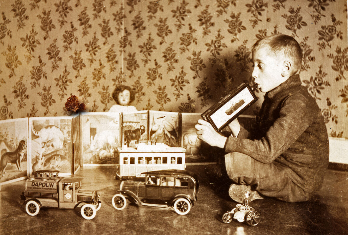 Kinderträume. Das Bild zeigt Willi Wollpert, den Bruder von Walter Otts Mutter als Kind, umgeben von schönem Spielzeug.
