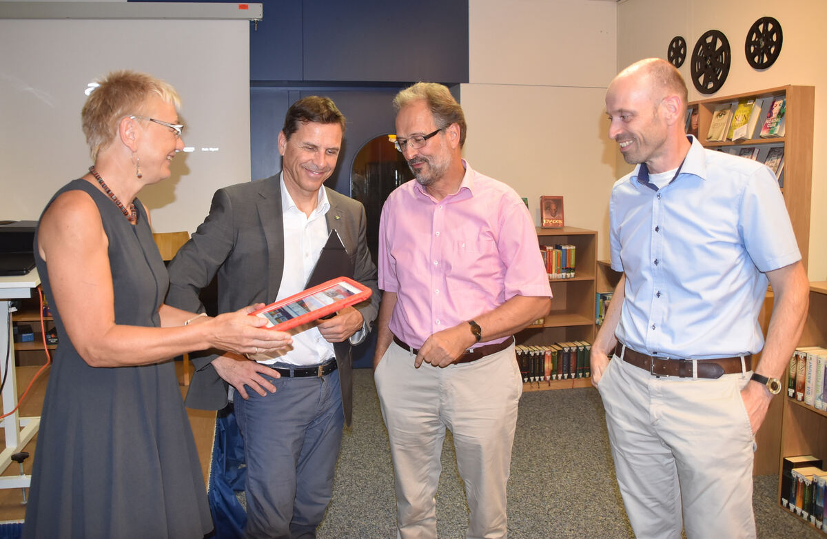 Auf geht’s ins Tablet-Quiz: (von links) Mediotheksleiterin Karin Lorenz, Bürgermeister Christof Dold, Ex-Kämmerer Dieter Haug und Nachfolger Markus Hillenbrand. FOTO: SANDER