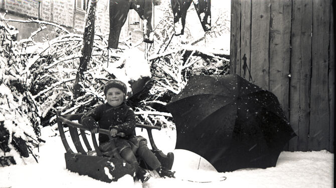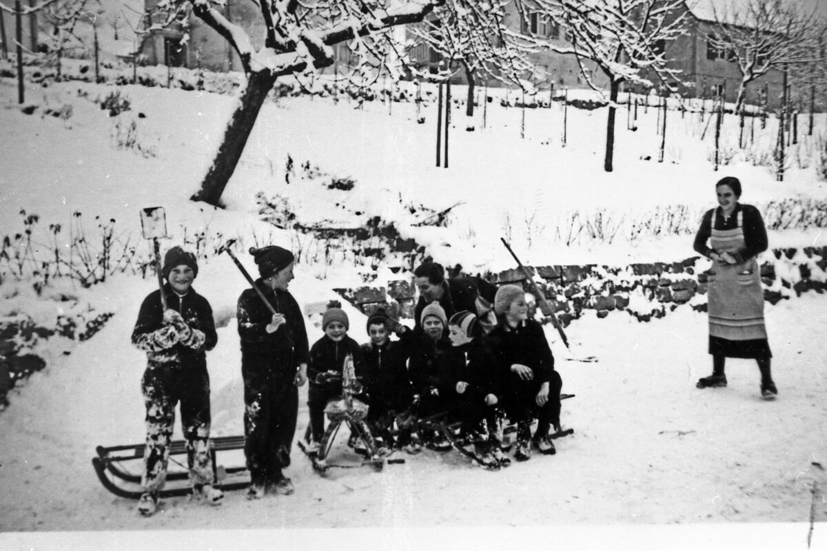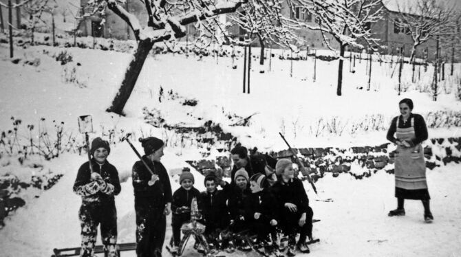 Frühe Wintervergnügen: Das Bild zeigt eine Gruppe acht- bis zehnjähriger Kinder beim Schlittenfahrer. Eine Mutter mit Schürze schaut - mit kalten Händen, ansonsten aber sichtlich entspannt - nach dem Rechten. Das dritte Kind von links sitzt auf einem Schlittengaul, die anderen auf moderneren Rodelschlitten. Der Bub links hat Schittschuhe an. Beim Bergabfahren auf der vereisten Richard-Burkhard-Straße konnte er damit besser lenken.