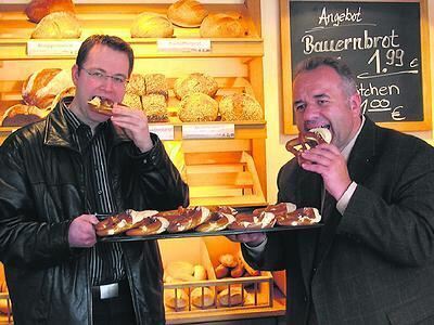 Sie lassen sich die Brezel munden, der Dettinger Produzent Frieder Scheiffele, Absolvent der Filmakademie Ludwigsburg, und der aus Metzingen stammende Schauspieler Winfried Wagner, Mundartdichter, Humorist und Autor der Mäulesmühle, der im Serien tauglichen Bäckerkrieg eine tragende Rolle inne hat.