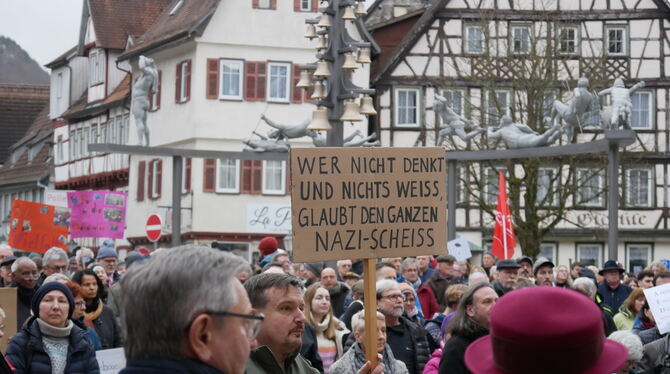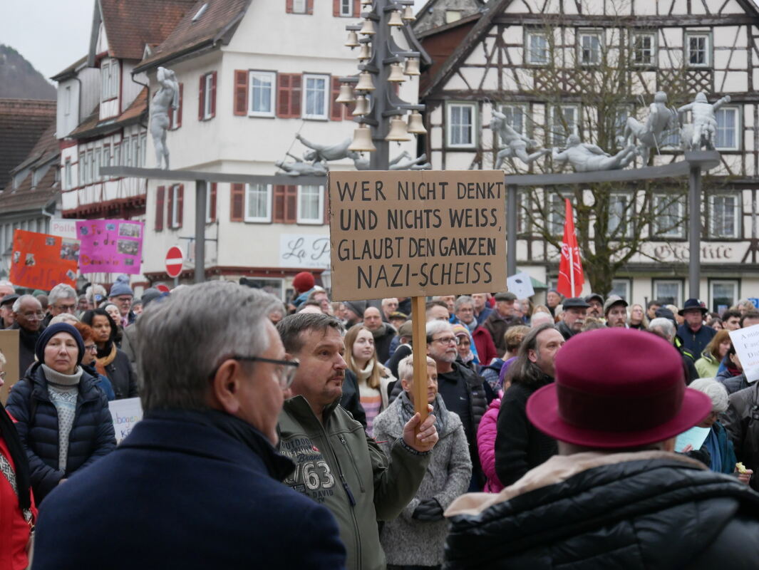Die sei, so auch die Ansicht der Bad Uracher Initiatoren, von verschiedener Seite bedroht. Die antidemokratischen und antisemitischen Transparente bei propalästinensischen Demonstrationen würden darauf hinweisen, neben dem Linksextremismus gebe auch der von rechts Grund zur Sorge. Das führe dazu, dass sich die Zivilgesellschaft wappnen müsse gegen die Gefahren, die der Demokratie und den Menschenrechten drohen würden. Die Demonstrationen in Bad Urach und anderen Städten seien ein wichtiges Signal dafür gewesen, dass die Menschen beginnen würden, sich zu wehren und ihre Sorge um die Demokratie zum Ausdruck gebracht hätten.