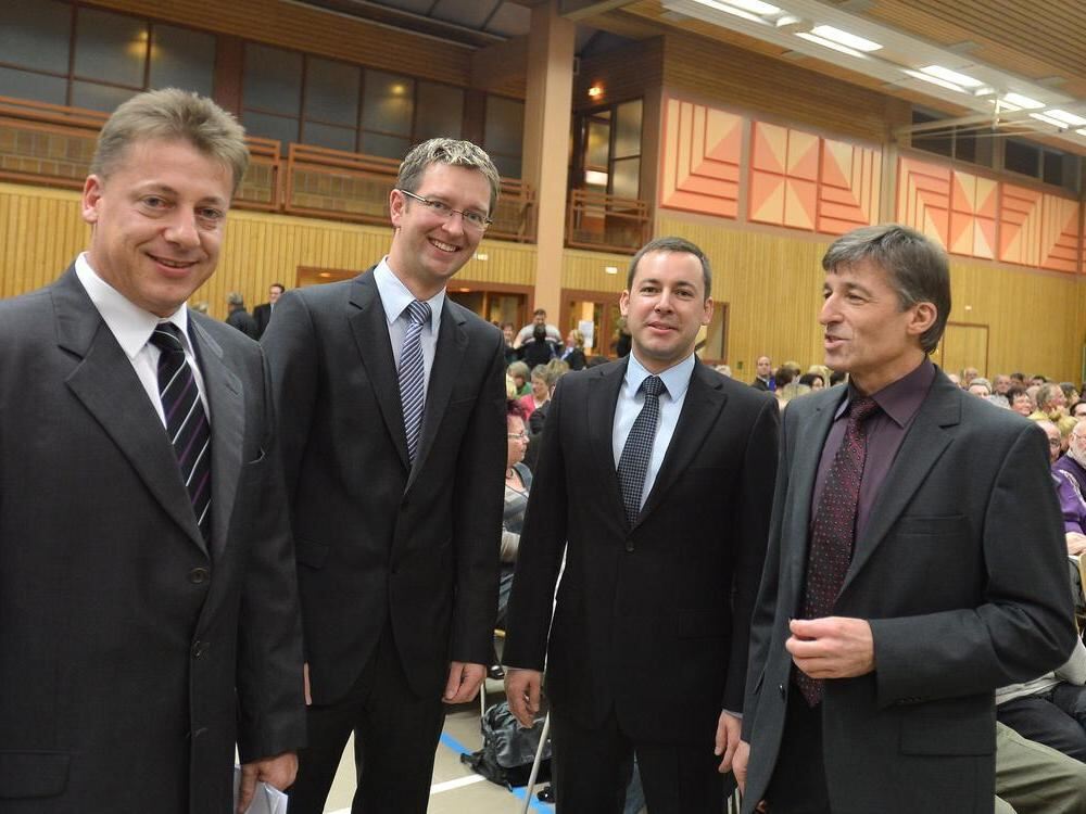 Drei, die Bürgermeister werden wollen (von links): Mathias Klimm, Tobias Pokrop und Felix Schiffner zusammen mit Amtsinhaber Klaus Bender, der zur Wahl nicht mehr antritt.