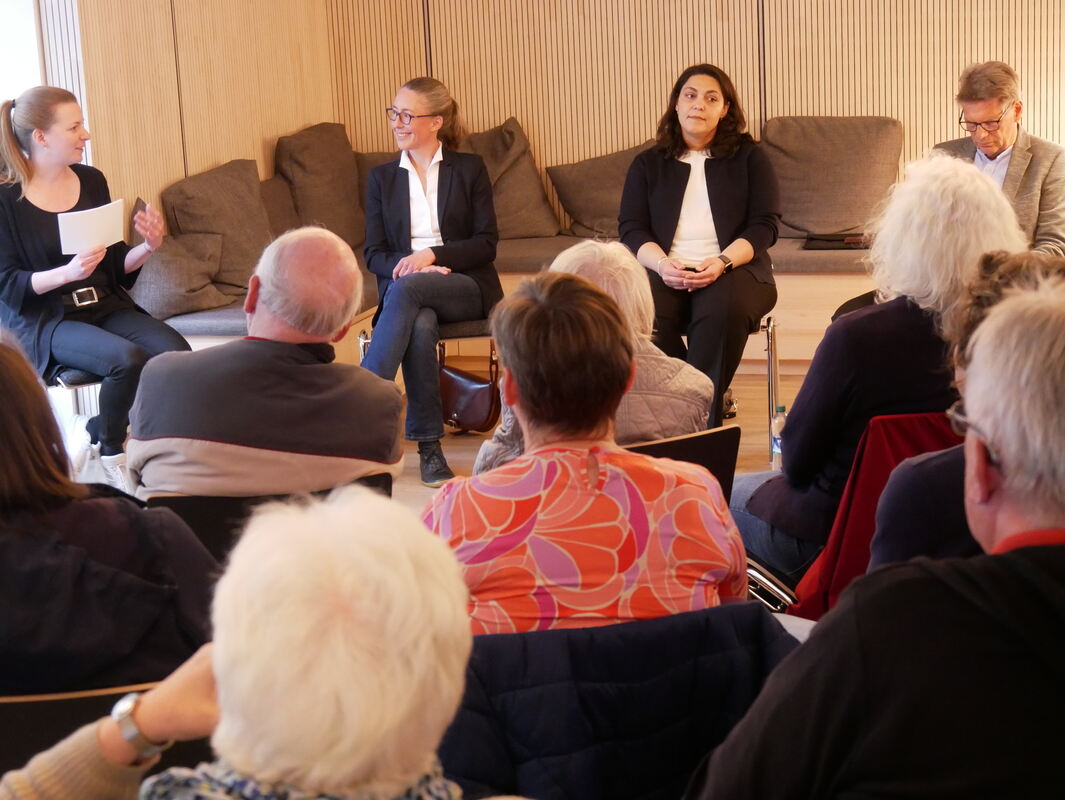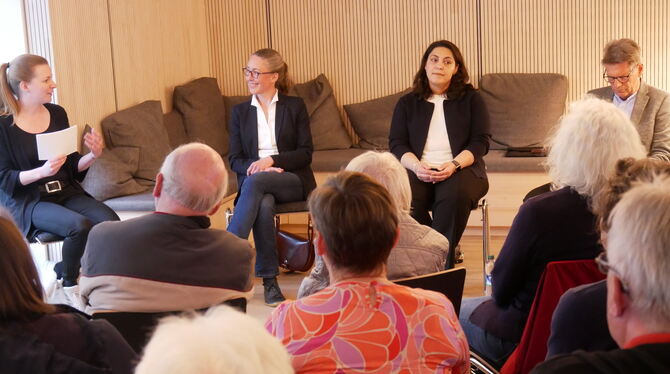 Beim dritten Uracher Stadtgespräch waren Richterin Dr. Katja Rieger und Bewährungshelferin Bajramse Kamberi (Mitte) zu Gast. Links und rechts die Moderatoren Veronica Zwink und Albert Ebinger.