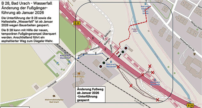Während des Abbruchs der Fußgängerunterführung und dem Bau der neuen B28 wird der Verkehr teilweise auf einer Behelfsfahrbahn südlich am Baufeld vorbeigeführt. Die ersten Arbeiten zum Bau der Behelfsfahrbahn haben im Dezember begonnen. Für die Fertigstellung der Behelfsfahrbahn und den Abbruch der Fußgängerunterführung, müssen die Fußgängerunterführung und die Bushaltestelle »Wasserfall« in Fahrtrichtung Münsingen ab Montag, 12. Januar, gesperrt werden. Die Fußgänger werden bis zur Fertigstellung der Fuß- und Radwegebrücke mittels einer Fußgängerampel gesichert über die B 28 und weiter am Rand des Baufelds zur Immanuel-Kant-Straße geführt.