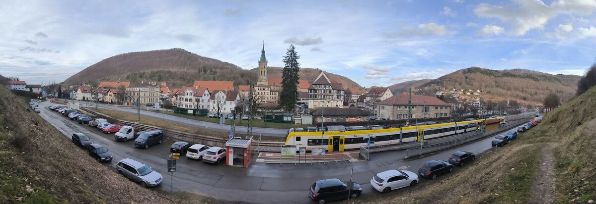 Im Rahmen des Mobilitätskonzepts der Stadt Bad Urach könnte der Bahnhof - hier die Endhaltestelle - auf die andere Straßenseite zum ZOB verlegt werden.