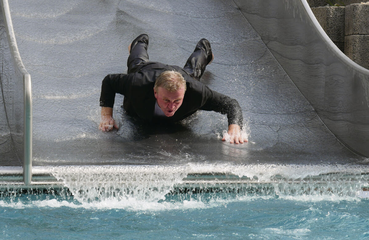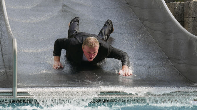 Mit seiner Dienstkleidung geht Elmar Rebmann normalerweise sorgsamer um. Am Mittwoch rutsche er im Anzug mit Karacho und sichtlichem Vergnügen von der Wellenrutsche.