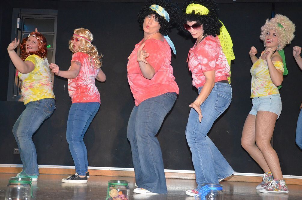 »Lass mich dein Badewasser schlürfen«, singt Dekanatsreferent Thomas Münch zusammen mit dem A-cappella-Quartett »Schellack«. Das Reutlinger Tanzensemble »Shirley Apple & The Sweet Peas« zeigt gekonnt Musik aus unterschiedlichen Jahrzehnten. FOTO: SANDER
