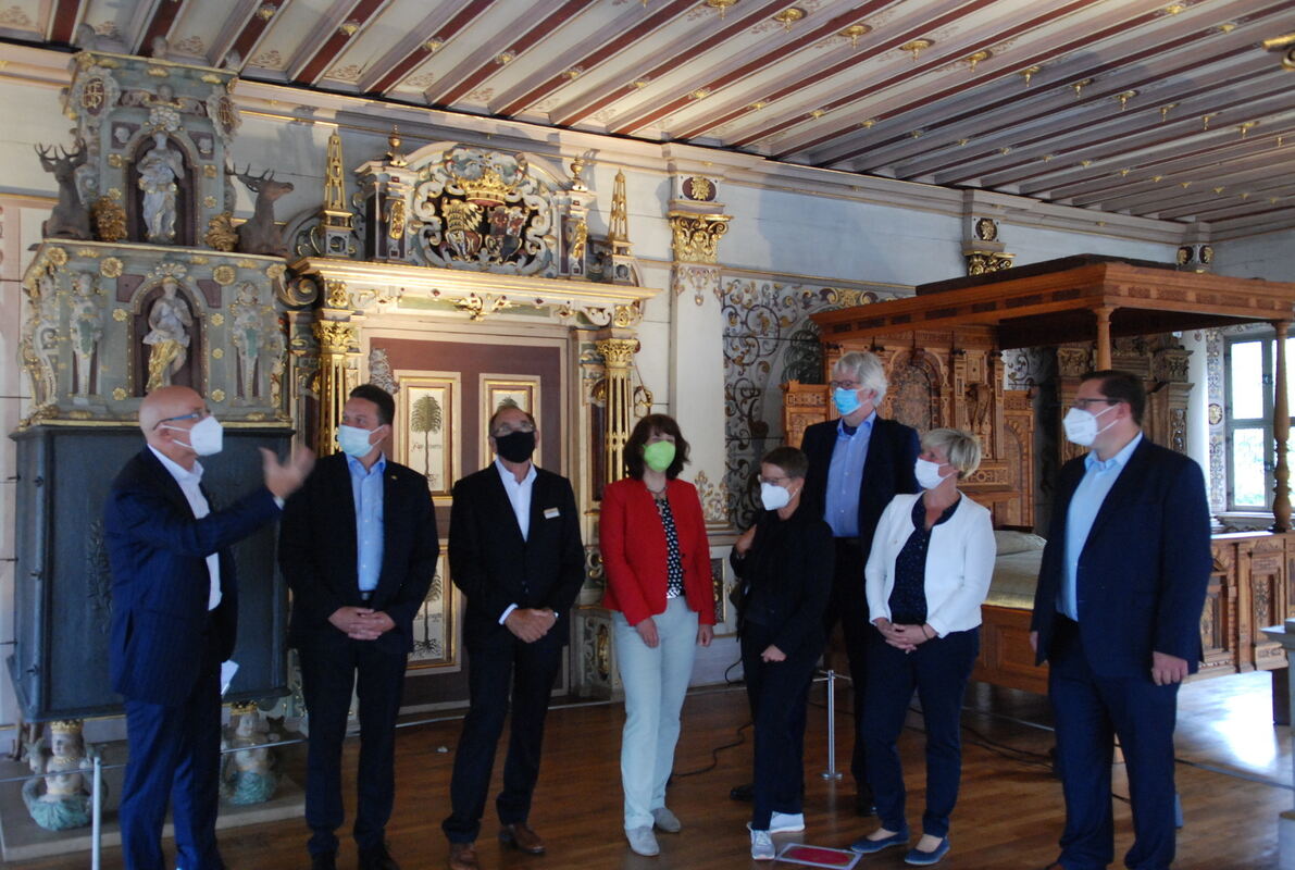 Finanzstaatssekretärin Gisela Splett (in Rot) bekommt von Michael Hörmann (links) von den Staatlichen Schlössern und Gärten den Goldenen Saal erklärt. Mit dabei sind Urachs stellvertretender Bürgermeister Werner Grad (links neben Splett) und die Landtagsabgeordneten Cindy Holmberg (Zweite von rechts) und Manuel Hailfinger (Zweiter von links). FOTOS: PFISTERER