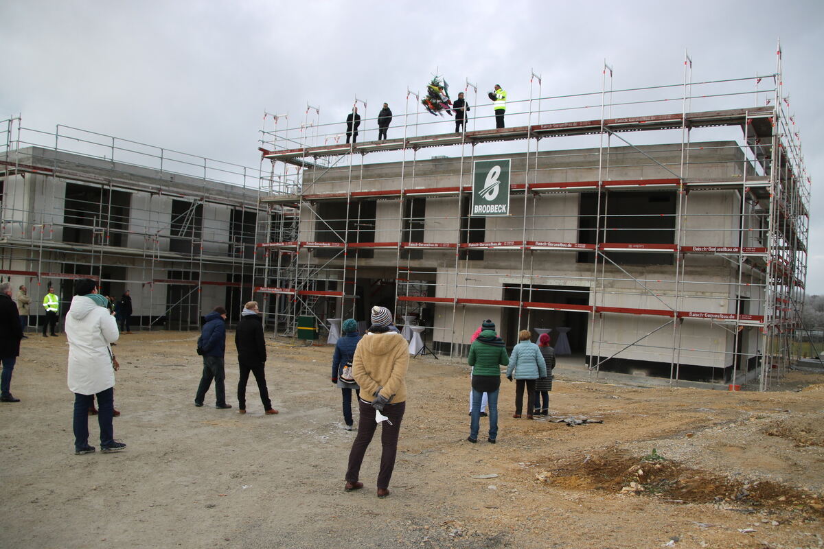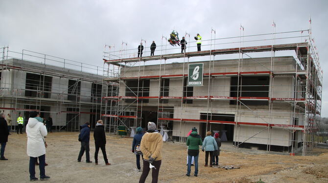 In luftiger Höhe sprach Polier Markus Buck auf dem Dach des künftigen Kinderhauses den Richtspruch. Mit dabei waren Pfarrer Dr. Jörg Breitschwerdt, Architekt Matthias Ott und Hülbens Bürgermeister Siegmund Ganser.