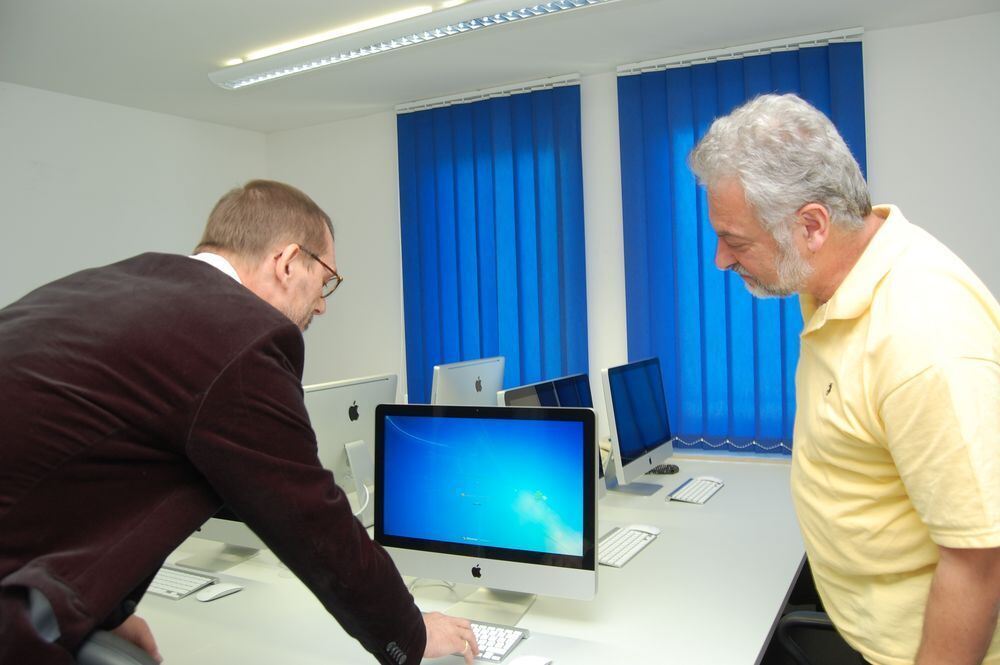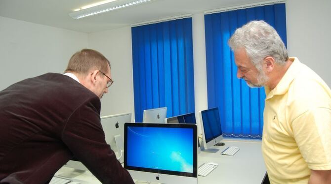 Norbert Schimanski (rechts), kommissarischer Leiter der VHS, und EDV-Experte Joachim Leutemann im Computerraum mit seinen sechs nagelneuen Geräten.