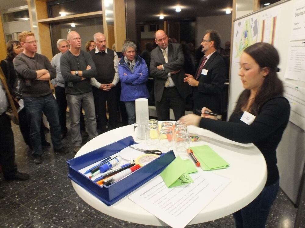 Eine lebhafte Diskussion entspann sich an der Themeninsel »Baumsatz« mit Kämmerer Dieter Haug (Zweiter von rechts) als Experten und Jessica Peringer (rechts) als Moderatorin und Schriftführerin.