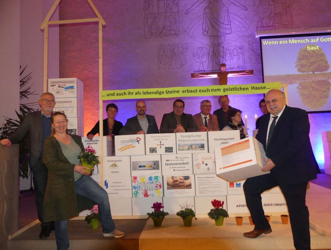 Kirche versteht sich als »Haus der lebendigen Steine«, die die vielfältige Gemeindearbeit darstellen. Dekan Michael Karwounopoulos trägt einen davon, mit dabei sind (von links) Schulleiterin Ulrike Fetzer, Dekan Norbert Braun, Moderatorin Dr. Kathrin Messner, Pfarrer Jörg-Michael Karle, Bürgermeister Patrick Hubertz und die Pfarrer Albrecht Schäfer und Siegfried Häußler, Schuldekanin Gudrun Bertsch und Kirchengemeinderat Martin Notz. FOTO: SANDER