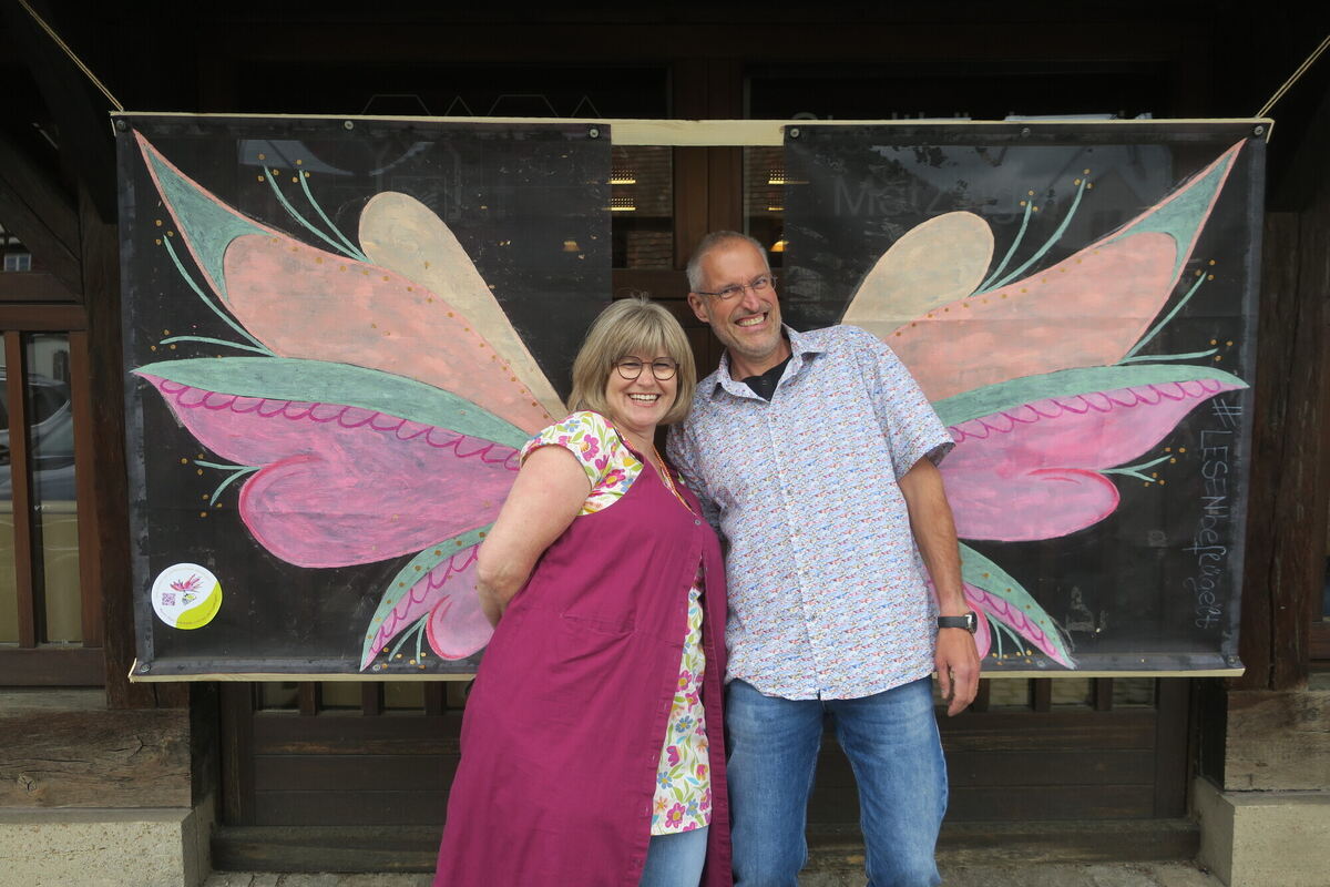 Ulrich Koch und Maren Duhatschek stellen vor der Metzinger Bücherei am Kelternplatz die Sommeraktion »Nimm Platz, verweile und lass Dich beflügeln« vor. Die Flügel für Selfies und Fotos rund um die Bücherei haben sie mit Unterstützung kreativ selbst gemalt. FOTO: MERKLE