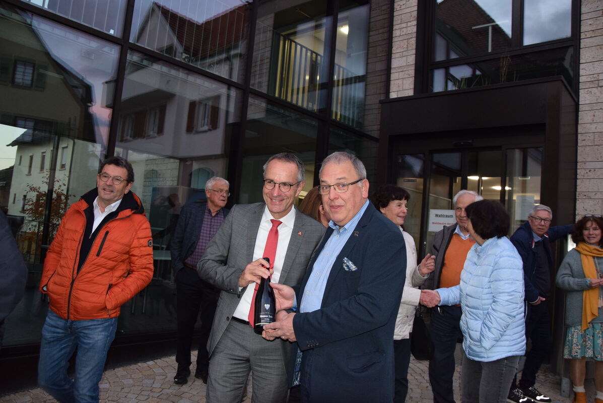 Reutlinger Schampus aus dem Weinberg der Stadt zur Wiederwahl: OB Thomas Keck gratulierte Bernd Haug (links) als Erster zur Wiederwahl. FOTO: KREIBICH