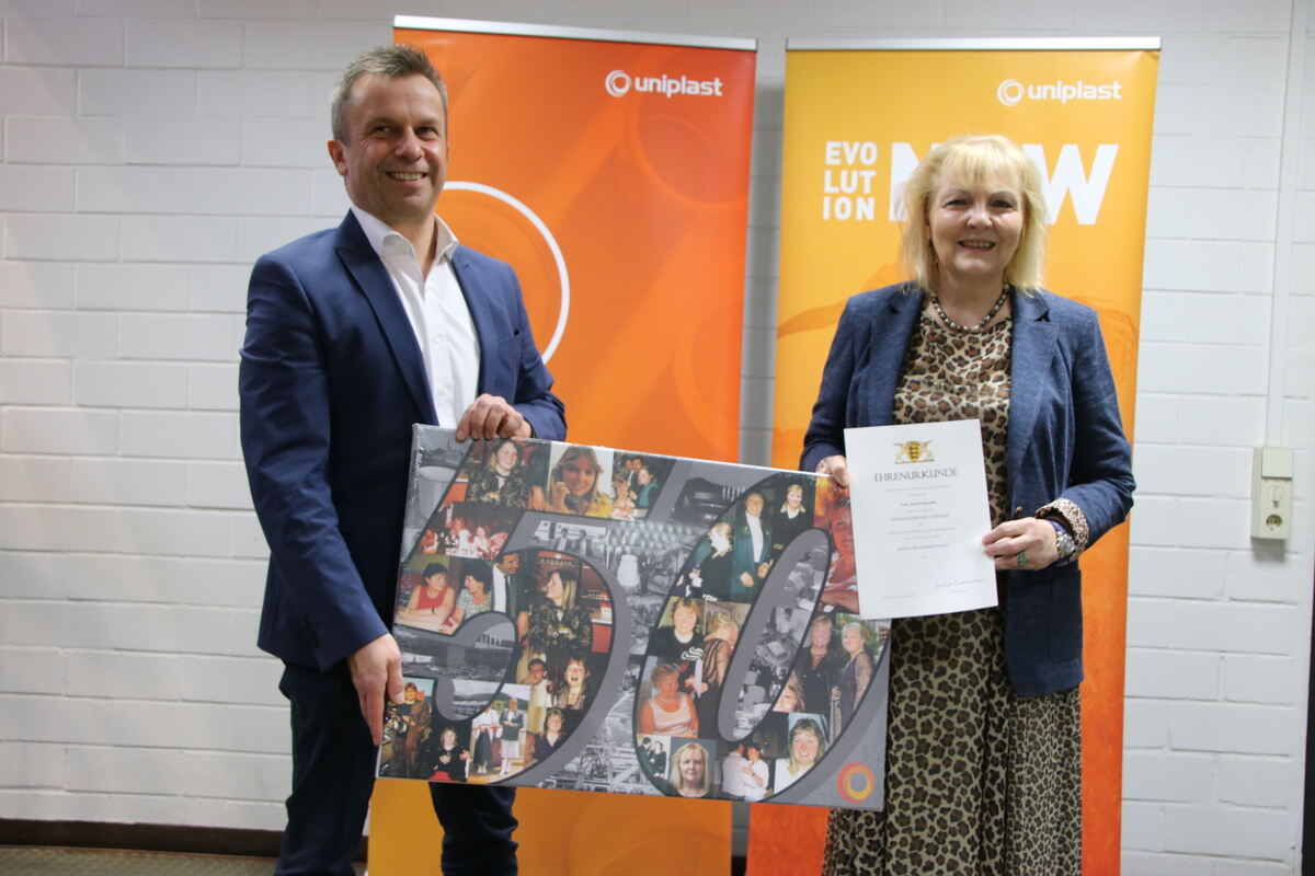Betriebsjubilarin Astrid Kanduth mit Uniplast-Geschäftsführer Andreas Doster − die Belegschaft hat ihr eine Fotocollage mit Bildern aus den vergangenen 50 Jahren geschenkt. FOTO: OECHSNER