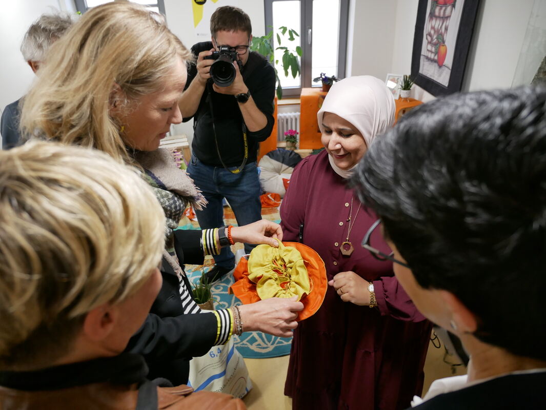 Eine Teilnehmerin an dem nachhaltigen Metzinger Integrationsprojekt erklärte Umweltministerin Thekla Walker (2. von links) am Samstag einen kleinen Beutel, der zuvor Teil einer Flagge war.