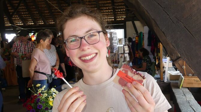 Lolly von der Bonbonmanufaktur gedreht, Rosenseife von den eigenen Eltern gezaubert: Johanna Görlach zeigt zwei Besonderheiten auf dem Pfingstkunstmarkt. Mit ihren 14 Jahren weiß sie schon, dass sie später auch Seifen sieden will. FOTO: SANDER