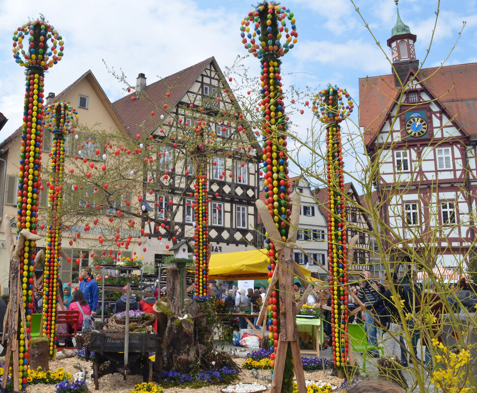 Gerlinde Schneider (links, oben) aus St. Johann-Upfingen beherrscht die Kunst »Wiener Geflecht« herzustellen, bekannt durch die berühmten Kaffeehausstühle. Auf dem großen Ostermarkt im Residenzschloss in Bad Urach (links, unten) gab es außerdem allerlei Selbstgemachtes wie Finger- und Wollpuppen. Auf dem Marktplatz begeisterte die bunte Osterdeko die Besucher. FOTOS: SANDER