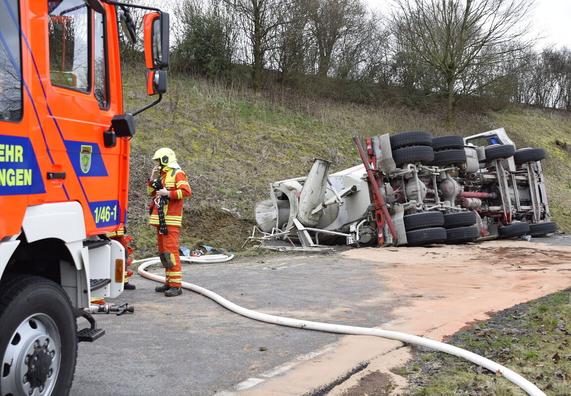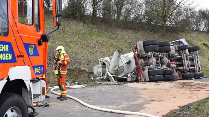 Betriebsstoffe und Diesel sowie eine kleine Menge Flüssigbeton waren ausgelaufen und das Erdreich musste rund um die Unfallstelle abgetragen werden. Dazu waren Vertreter des Umweltamts und Mitarbeiter eines Betonwerks vor Ort. Die Auffahrt in Richtung Metzingen gegen 16 Uhr wieder freigegeben werden. Die Verkehrspolizei hat die Ermittlungen zum genauen Unfallhergang aufgenommen. (GEA)