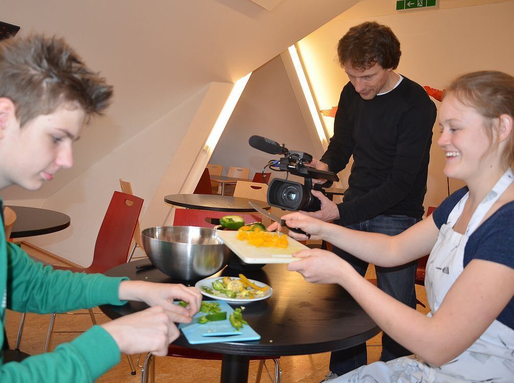 Der Achtklässler Pascal Mutsch zeigt mit FSJlerin Corinn Holder, was er bei der Essenszubereitung drauf hat. Beide sitzen vor der Kamera des erfahrenen Filmemachers Stefan Adam, der das Bewerbungsclip-Projekt mit Theaterpädagogin Beate Duvenhorst leitet. FOTO: MARA SANDER