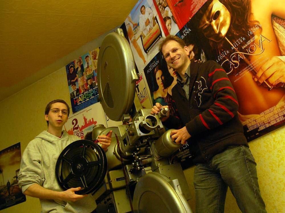 Die Luna-Aktiven Thorsten Hail (rechts) und Achim Störmer, Erster und Zweiter Vorsitzender des Stadtjugendring Bad Urach als Kinobetreiber, vor einem unverwüstlichen Ernemann-Projektor aus den Fünfzigern.