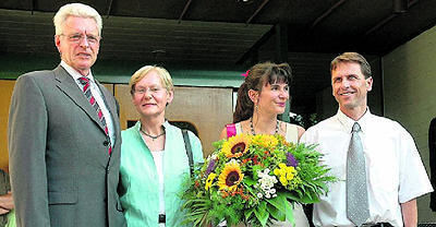 Gruppenbild mit Damen: Der Pliezhäuser Bürgermeister Otwin Brucker (links) präsentiert zusammen mit seiner Frau Heide seinen Nachfolger Christof Dold (rechts) mit seiner Frau Cristina. Anfang Oktober will der neue Schultes anfangen.