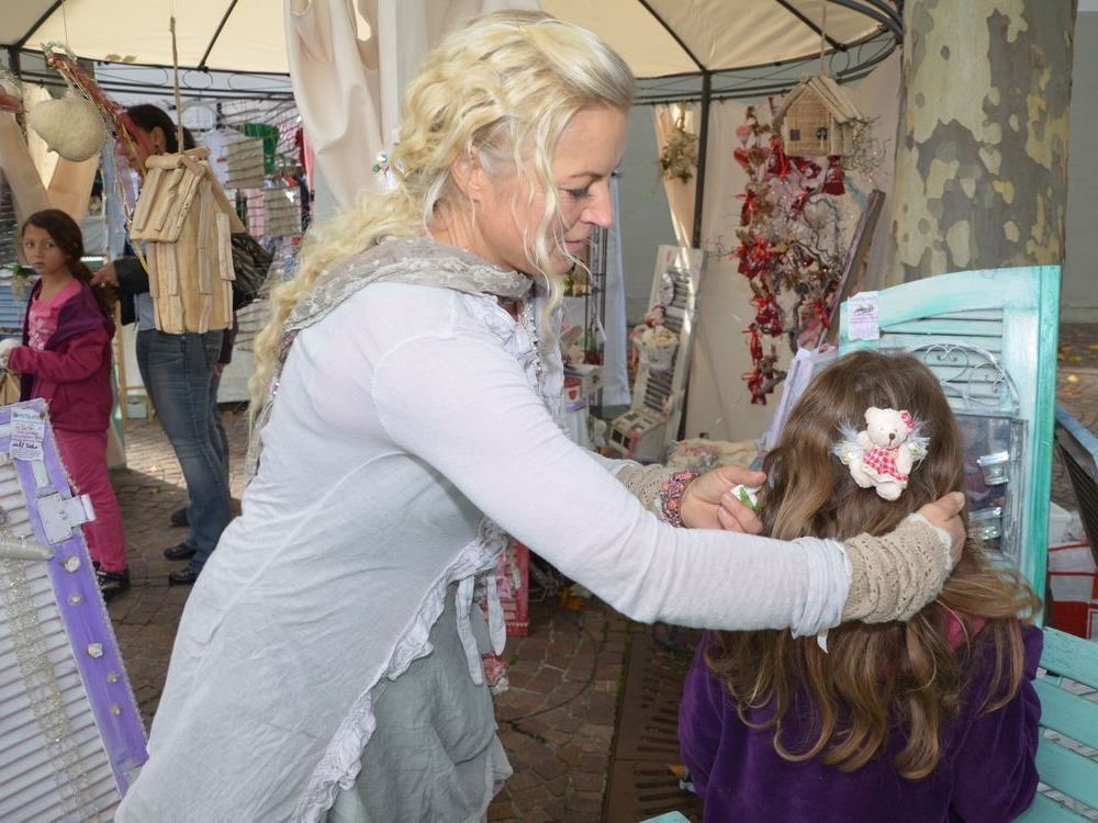 Sandra Kahlenberg auf dem Kunsthandwerkermarkt in Dettingen mit einer jungen Kundin.