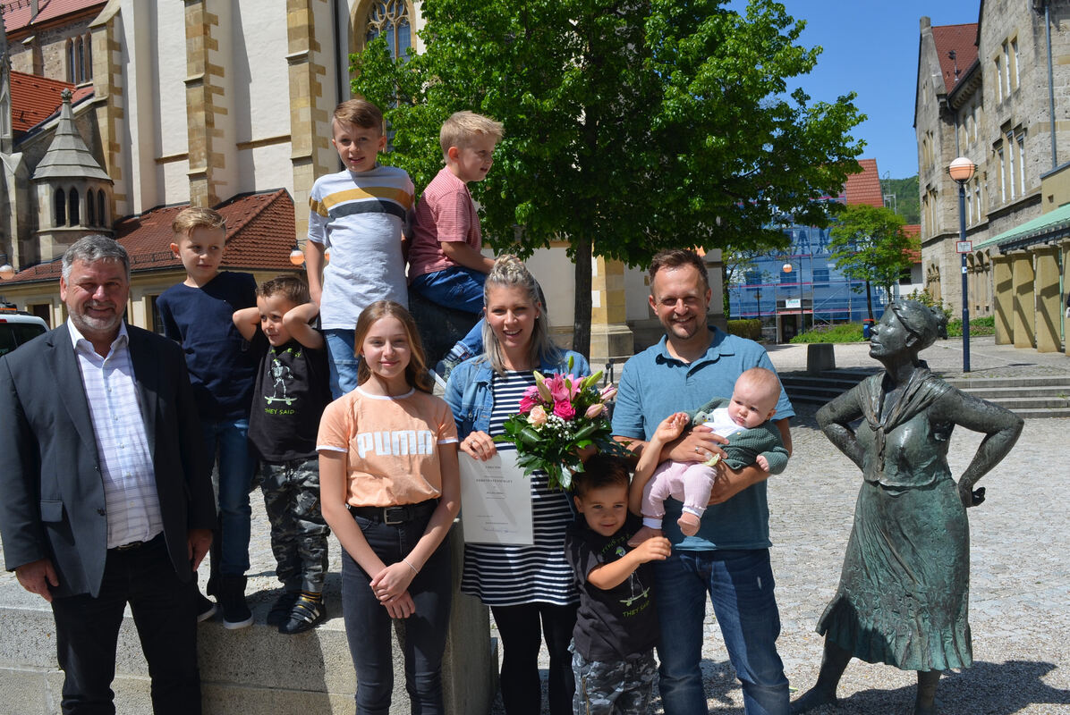 Bürgermeister Michael Hillert (links) mit der neunköpfigen Familie Hiller. FOTO: SANDER