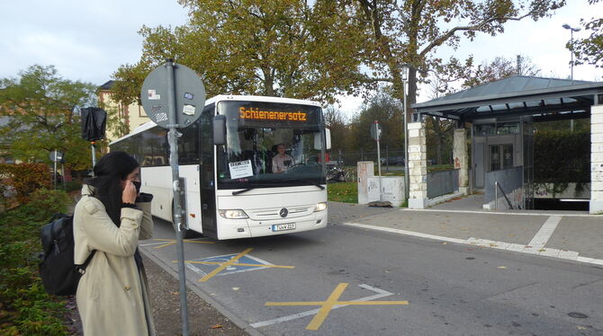 Eine Frau setzt schon mal ihren Mundnasenschutz auf, als der Bus nach Nürtingen in Tübingen einfährt. Dieser ersetzt noch bis zum Freitag die Züge auf der Strecke. FOTOS: LENSCHOW
