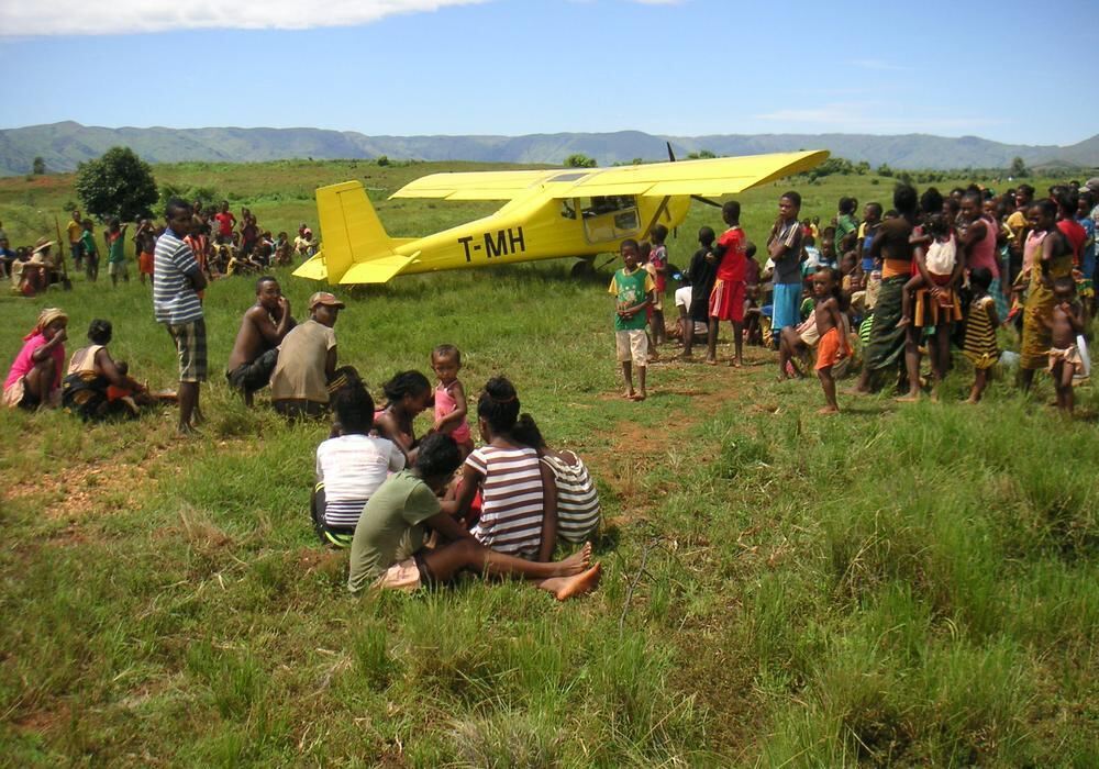 Von vielen ersehnt: Das Ultraleichtflugzeug, mit dem Michael Kässer vom LSV Roßfeld ein Jahr lang medizinische Hilfe gebracht hat, ist in Tsaratanana gelandet. FOTO: PRIVAT