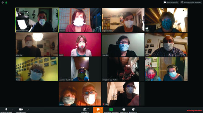 Siebzehn der rund 35 Sängerinnen und Sänger klickten sich ein und begrüßten sich fröhlich. Da ein chorischer Gesamtklang auf diesem Weg wegen der zeitverzögernden Übertragung unmöglich war, schaltete der Administrator alle auf stumm und die Teilnehmer hörten lediglich das Piano oder die eingespielten Playbacks des Chorleiters. Jeder sang seine Stimme vor dem heimischen Bildschirm, was dem Chor durch Übungen mit Audiodateien seit Langem vertraut ist.