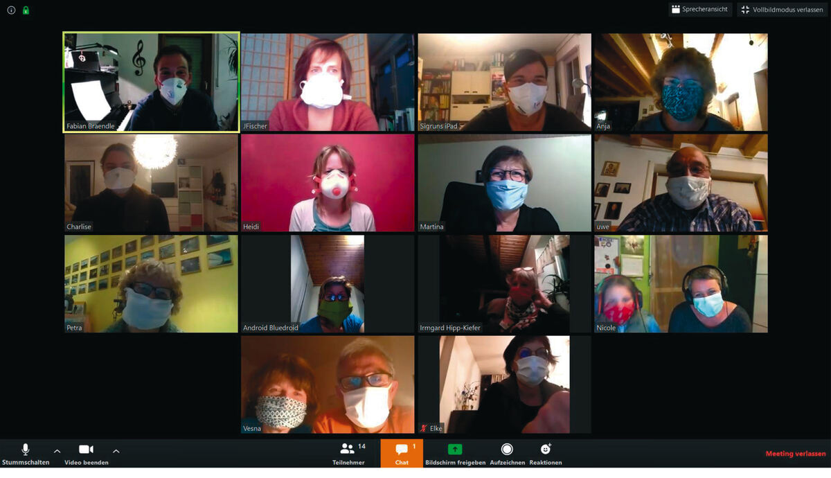 Die Vorsitzenden Petra Friedmann, Ulrike Rapp und Angelika Kirchner überbrückten diese Lücke vorerst mit motivierenden sonntäglichen E-Mails an alle Mitglieder. Schließlich sorgte aber Chorleiter Fabian Brändle für Abhilfe. Als Administrator einer Meeting-Plattform organisierte er eine Online-Probe zu gewohnter Probenzeit am Dienstag. Per Link konnten sich jene Sänger, deren Handys, Tablets oder PCs mit Mikro und Kamera ausgestattet sind auf die Plattform einwählen und so erschienen nach und nach die Gesichter der Chormitglieder auf dem Bildschirm.